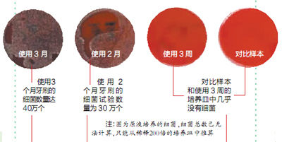 有实验室研究发现:无论健康者还是病人使用的牙刷,如果使用超过3个月,牙刷绒毛都会充斥大量细菌,其中包括非致病菌和致病菌。不管使用者口腔破损或健康,病菌都会通过伤口或食道进入人体,引起疾病的发生。你有多久没换牙刷了?