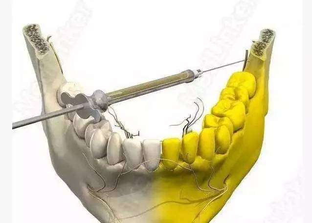 下牙槽神经阻滞麻醉剂注射于翼下颌间隙内下颌肢内侧的下牙槽神经沟周围,麻醉剂顺沟流入下颌孔而麻醉下牙槽神经,使该神经分布的区域产生麻醉效果。
